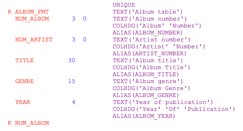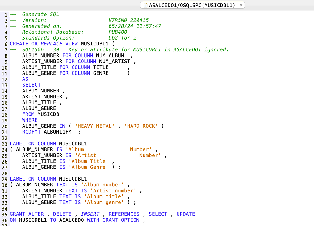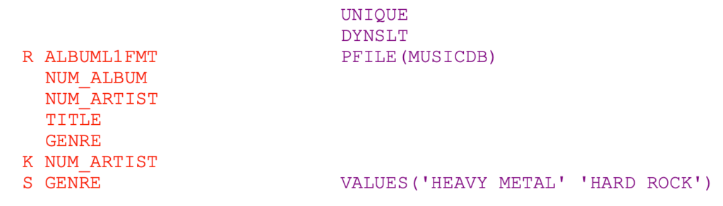 As you can see the file is a logical file with dynamic selection of records and only shows four fields of MUSICDB which is the psychical file that points to. It will only show records whose GENRE is HEAVY METAL or HARD ROCK.