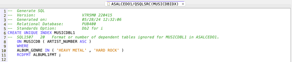 Now let’s code the SQL sentence to recover the source to a physical source file directly (remember that the member must exist). Recovery will take place on QSQLSRC physical source file in the MUSICDBIDX member and the type will be SQL.