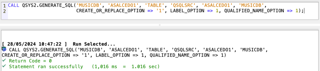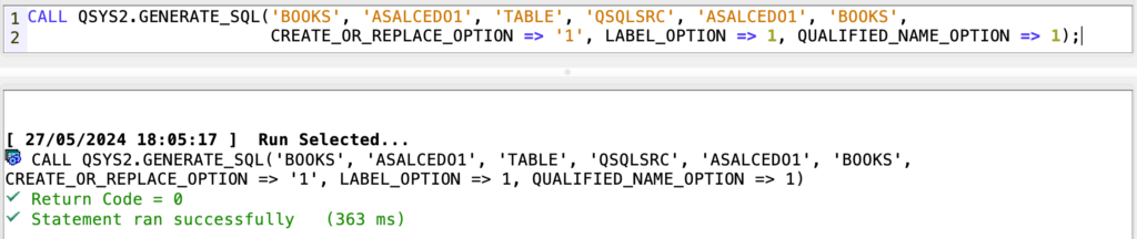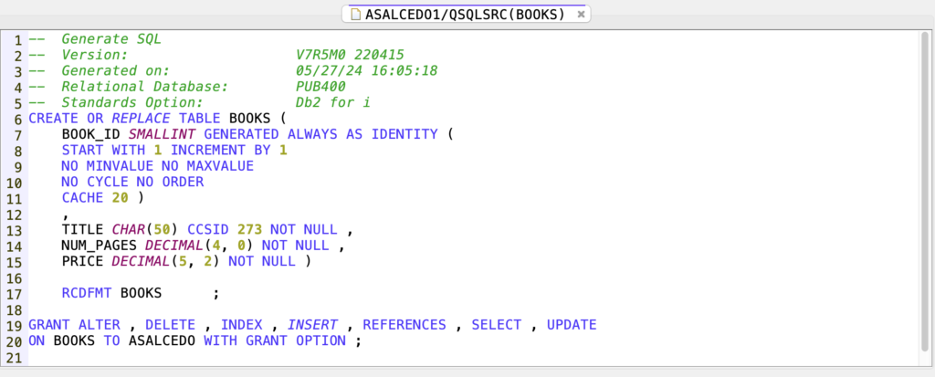 In this second example we want to convert old DDS file to new DDL. It doesn’t matter if we have the DDS or not because GENERATE_SQL will work with the file object.