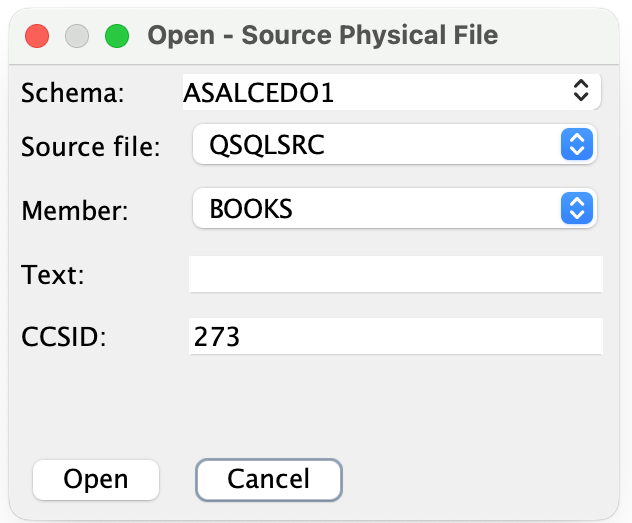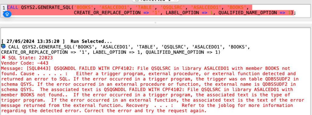 Now let’s modify the above SQL sentence to recover the source to a physical source file. Recovery will take place on QSQLSRC physical source file in the BOOKS member and the type will be SQL.